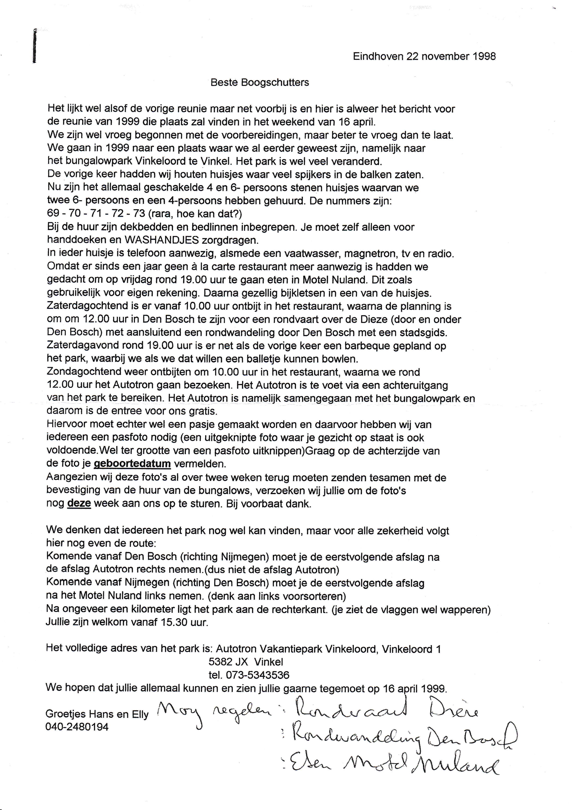 Wij hopen dat het weer een geslaagde reunie zal worden en dat het programma voor elk wat wils is.Mochten jullie nog vragen of opmerkingen hebben dan horen wij dat wel.